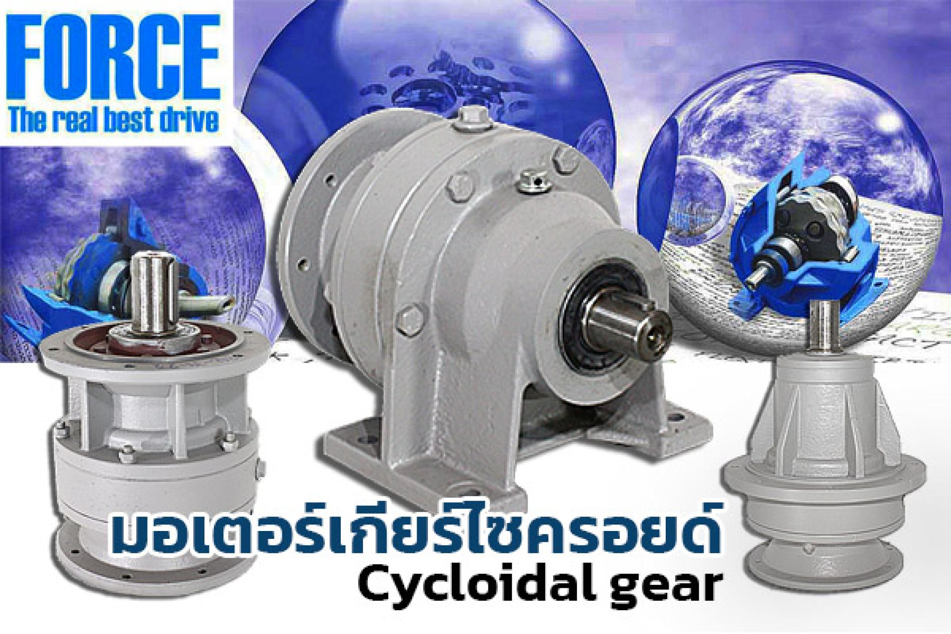 เกียร์ FORCE ต่างจาก Helical Gear คือ การใช้จานดิสก์ Cycloid Disc ที่หมุนเยื้องศูนย์ (off-center) ร่วมกับหมุด pins (Slow speed shaft pins) โดยจะหมุนสลับกันมีแบริ่งลูกเบี้ยว (Eccentric Cam) เพื่อกระจายแรงโหลด ทำให้ความเร็วลดลงและเพิ่มแรงบิด รับ Shock Load ได้ดีว่าเกียร์แบบทั่วไป ใช้งานร่วมกับมอเตอร์ไฟฟ้าแบบหน้าแปลนยึด B5 ได้หลากหลายแบรนด์ อาทิ มอเตอร์ไฟฟ้า Siemens , Mitsubishi , Hitachi , ABB , SUNTECH ฯลฯ ขนาดตั้งแต่ 0.25kw - 110kw ประกอบและทำสีให้ฟรี มี 3สีให้เลือก เทา เทาอมเขียว น้ำเงิน (สินค้าจากโรงงานจะพ่นเป็นเทาเคลือบกันสนิม) มีอัตราทดให้เลือกมากมายตั้งแต่ 1:6 ขึ้นไป